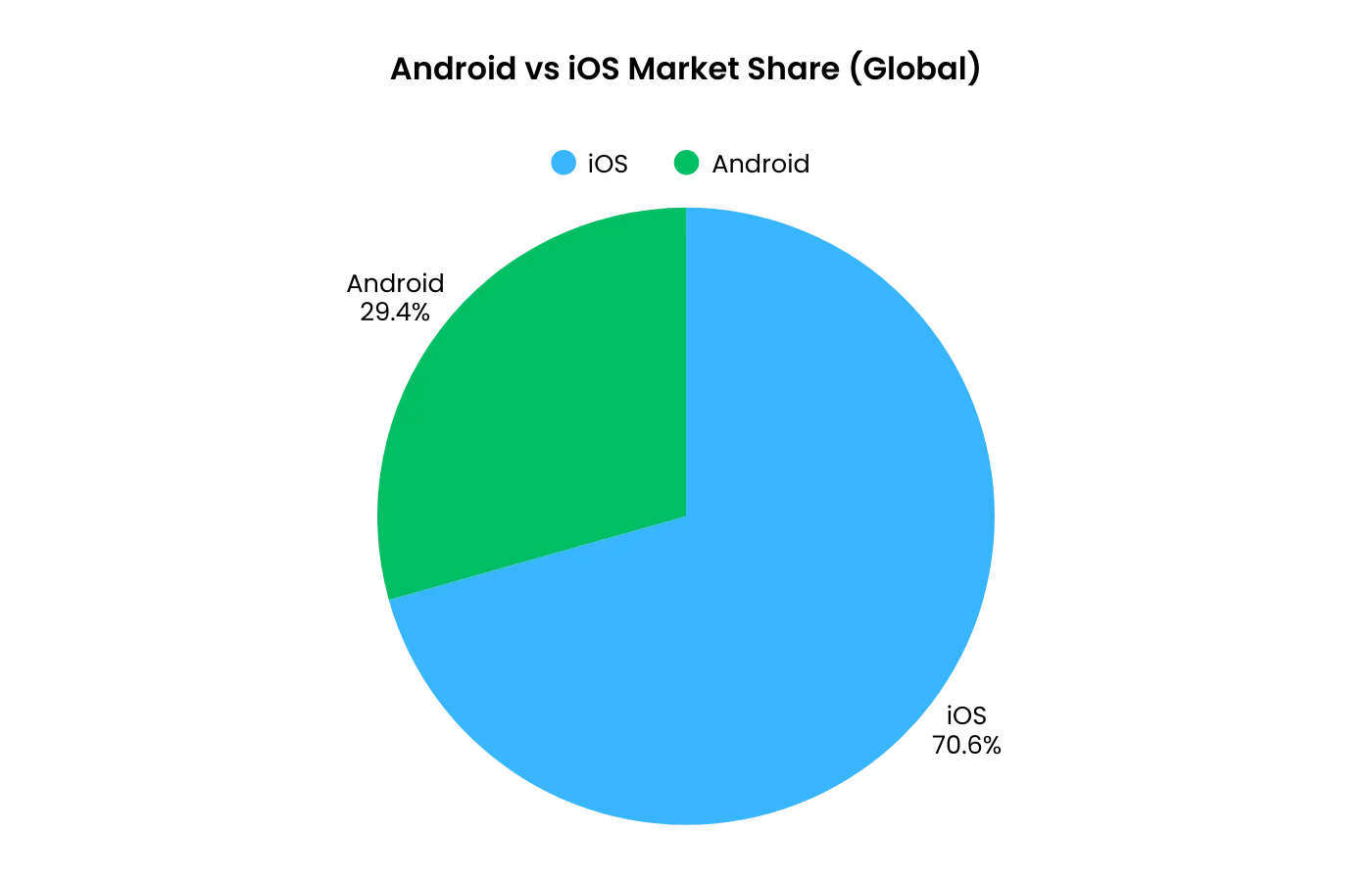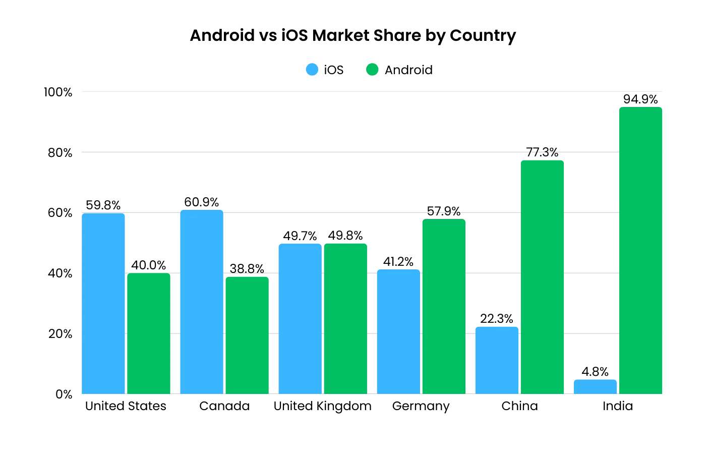 The split between Android and iOS varies significantly by country. In wealthier markets, iOS tends to lead or run close to even. In emerging markets, Android dominates by wide margins.