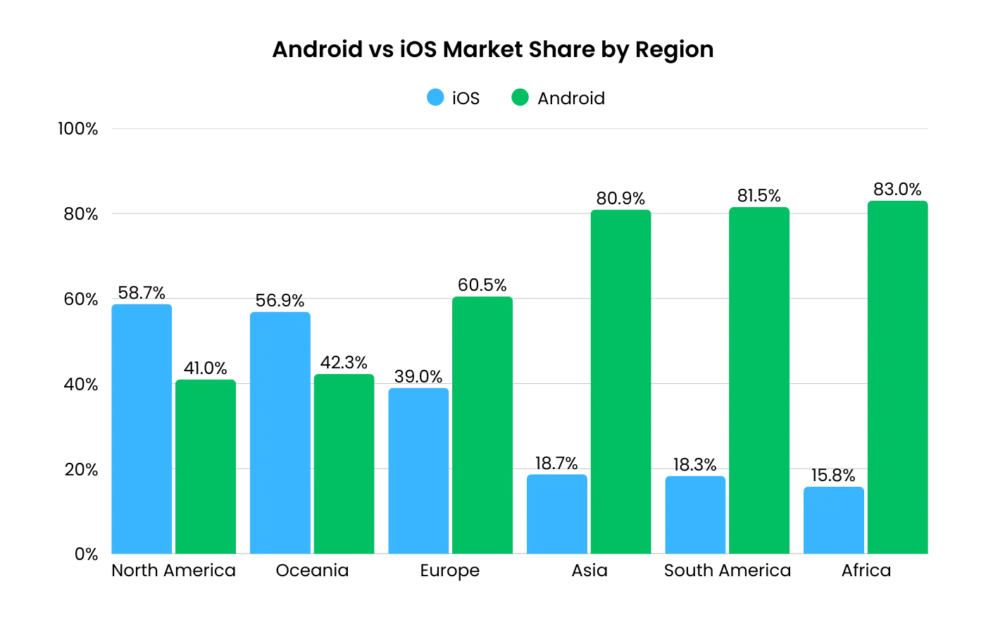 Zooming out to a continental level, the pattern is clear: iOS leads in North America and Oceania, while Android dominates everywhere else.
