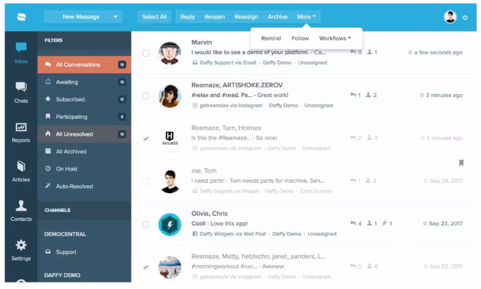 What it does: Reamaze combines live chat, chatbots, and helpdesk tools to turn customer service into a retention driver.