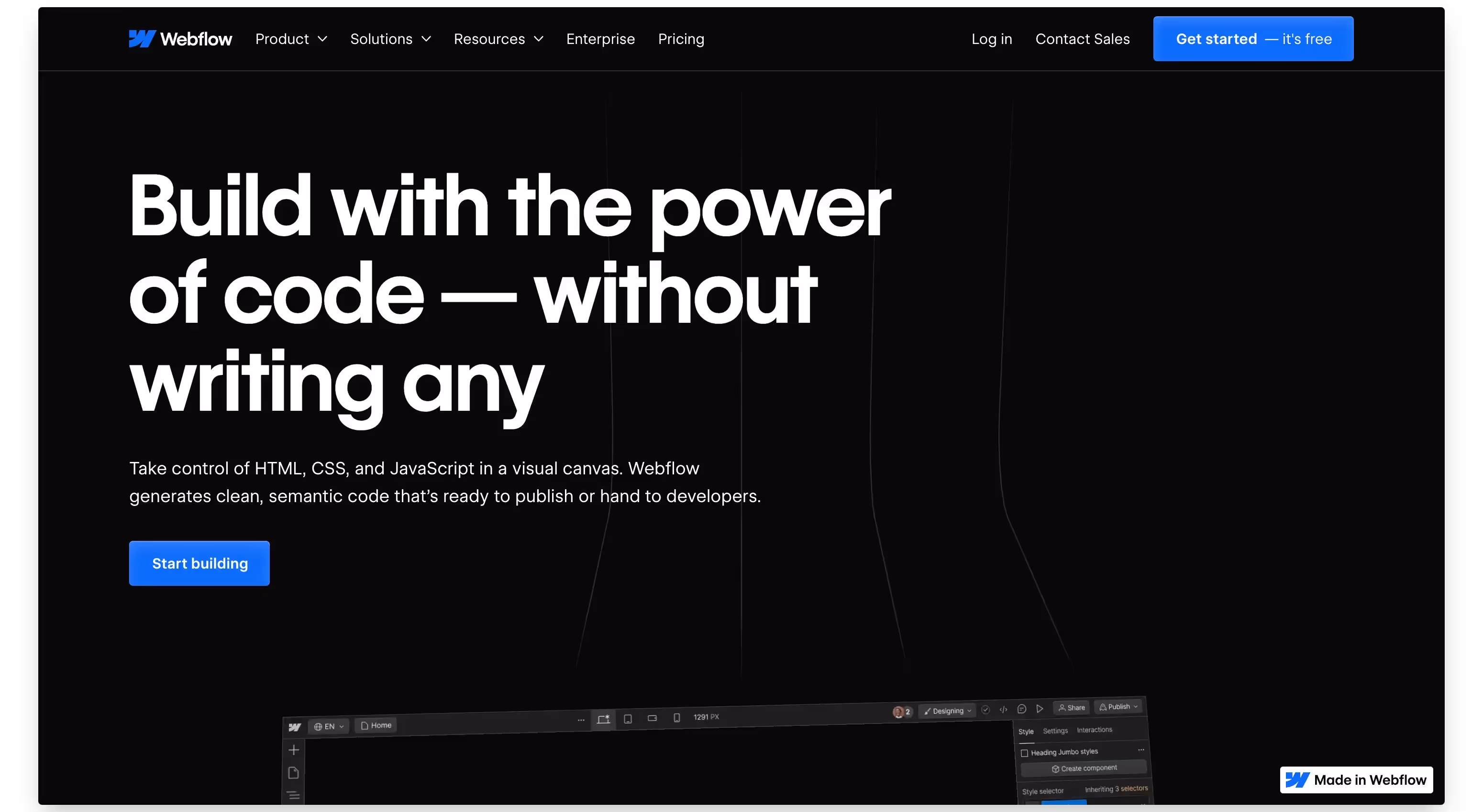 Webflow is a low-code website builder, similar to platforms like Squarespace and Wix, but with a little more technical flexibility, where you can play around with your site’s code to get everything perfect.