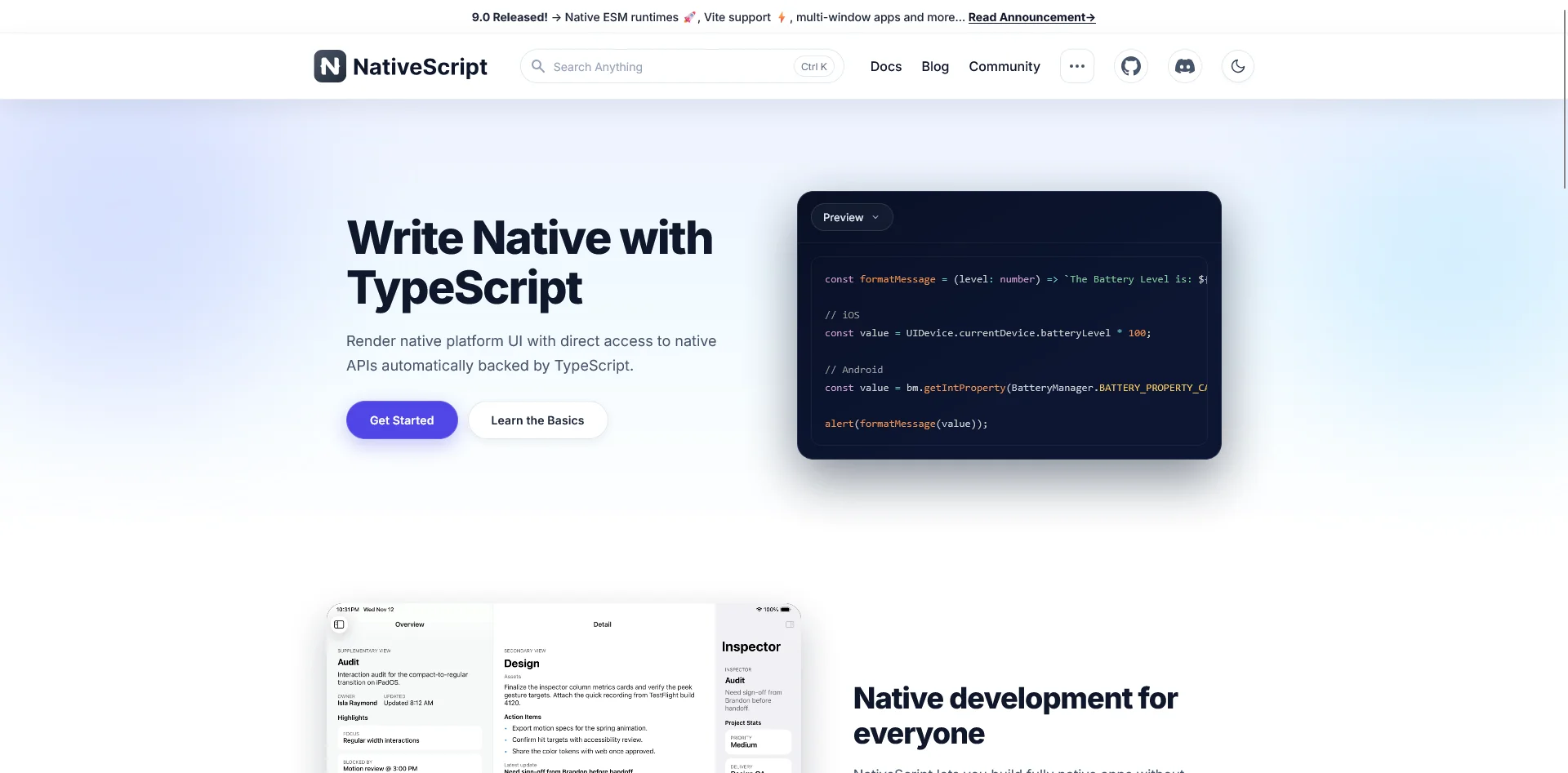 NativeScript takes a unique approach among JavaScript frameworks: it provides direct access to native platform APIs without requiring plugins or bridges. You can call any iOS or Android API directly from JavaScript or TypeScript code. This means you are not limited to the features that a plugin author has chosen to expose.