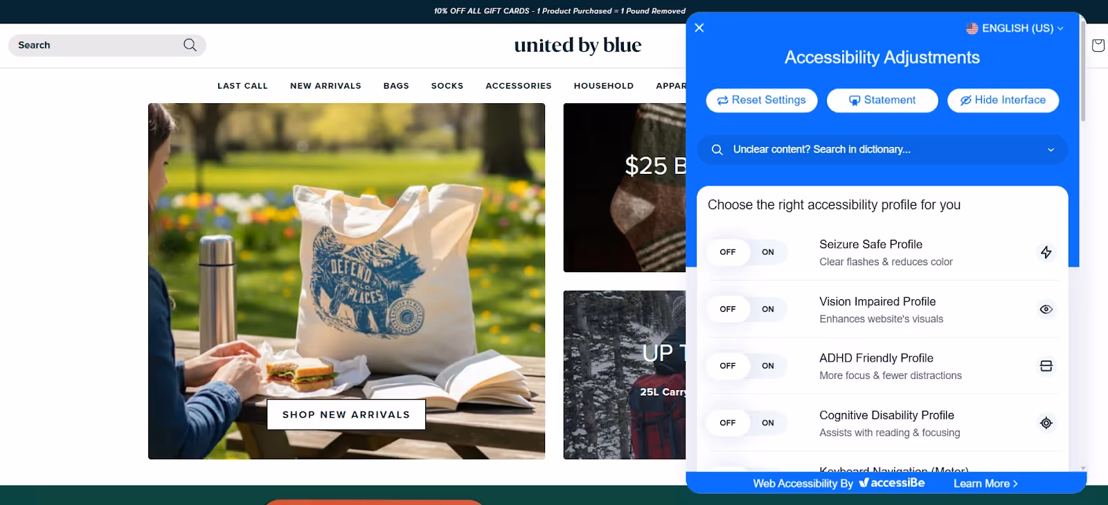 United By Blue is a great example of making things feel human. The brand adds an "Accessibility Adjustments" section. It includes multiple options to improve usability for different needs, like "ADHD Friendly Profile" and "Vision Impaired Profile." There's also a live chat button so customers can reach a real person fast.