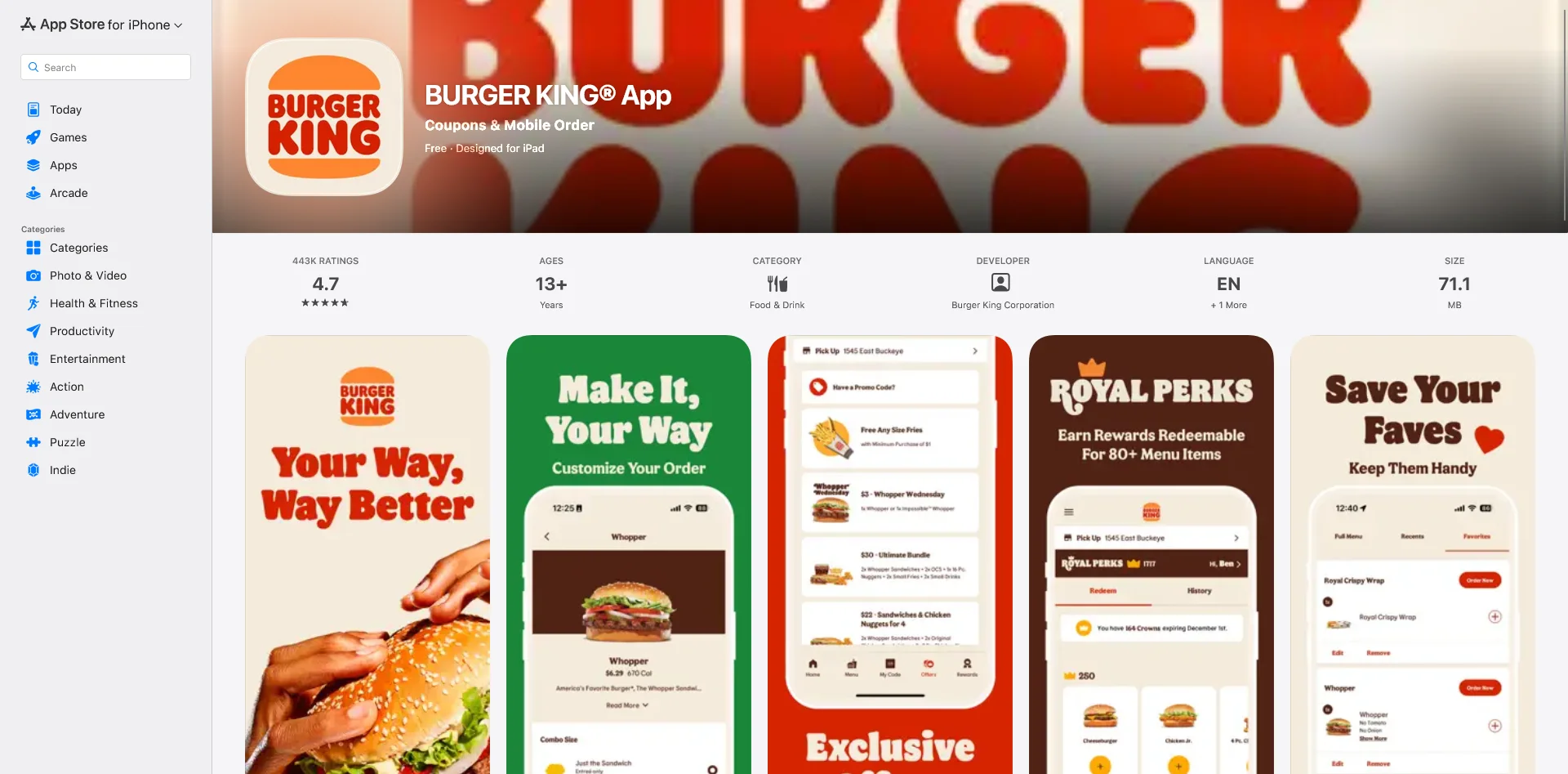 Burger King's app is built with Ionic, a hybrid framework that packages web applications as native iOS and Android apps. The app handles ordering, loyalty rewards, and promotions across multiple markets - all from a single codebase.