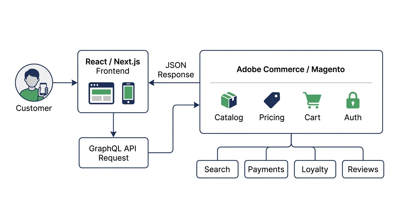 - Your Magento backend becomes an API-first commerce engine, exposing product data, catalog structure, pricing, cart, checkout, and customer data through a GraphQL API.