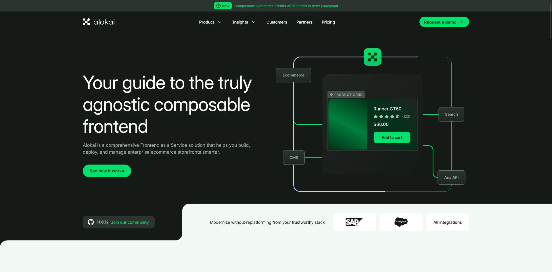Alokai is the most widely adopted headless frontend framework built specifically for Magento. The open-source edition uses Vue.js and Nuxt; the enterprise edition is built on React. It connects to Magento via GraphQL and provides a pre-built component library, integrations with common third-party services, and a developer experience designed around headless ecommerce patterns.