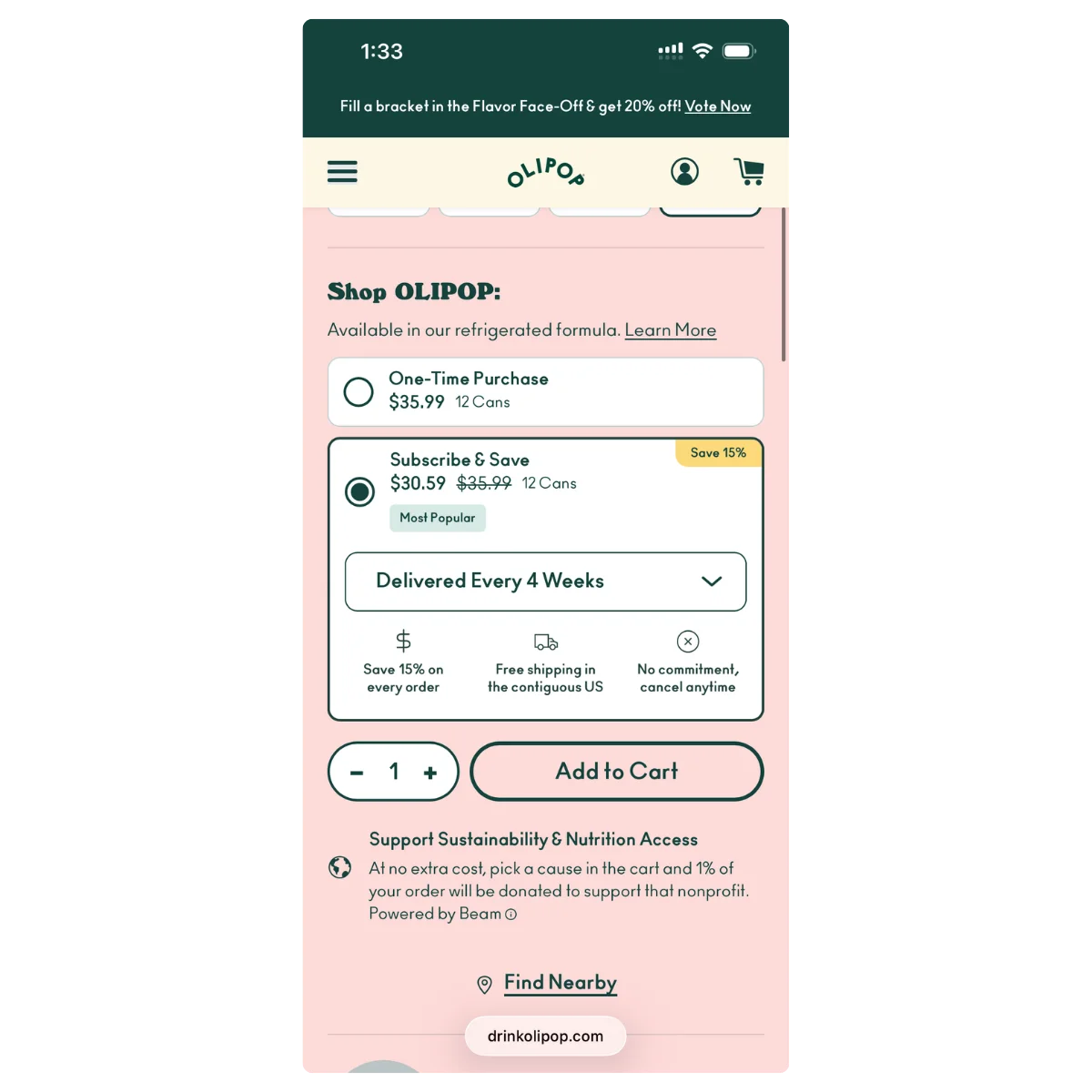 When a customer visits a product page, they see the option to choose between a one-time purchase and a subscription. This widget shows frequency options, discount tiers, and delivery schedules.