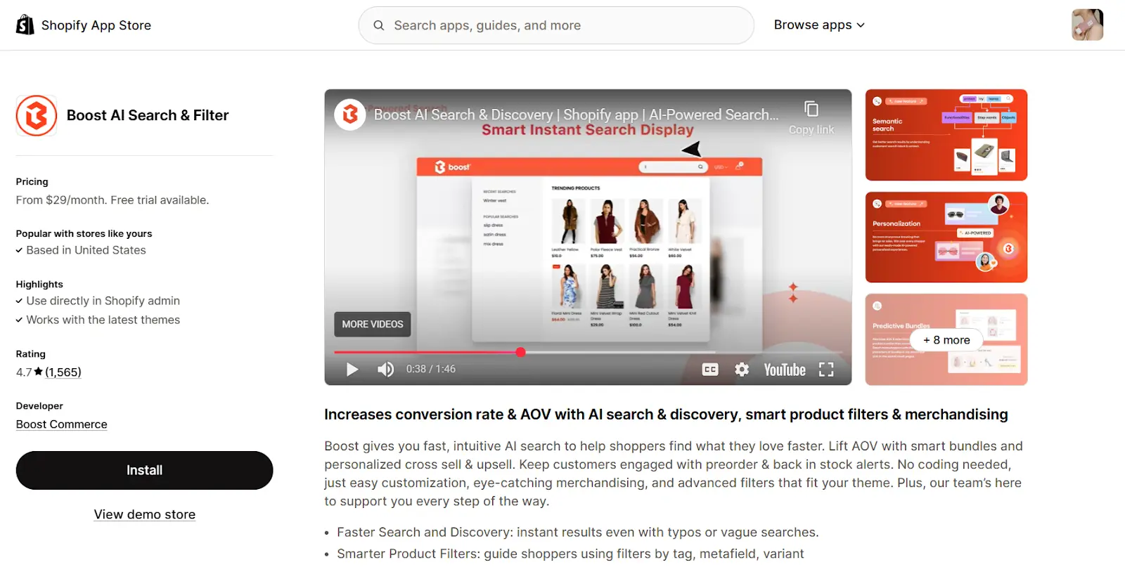 Boost AI Search & FIlter turns product discovery into a marketing advantage by increasing conversion rates and advancing the right products through merchandising rules and recommendations.