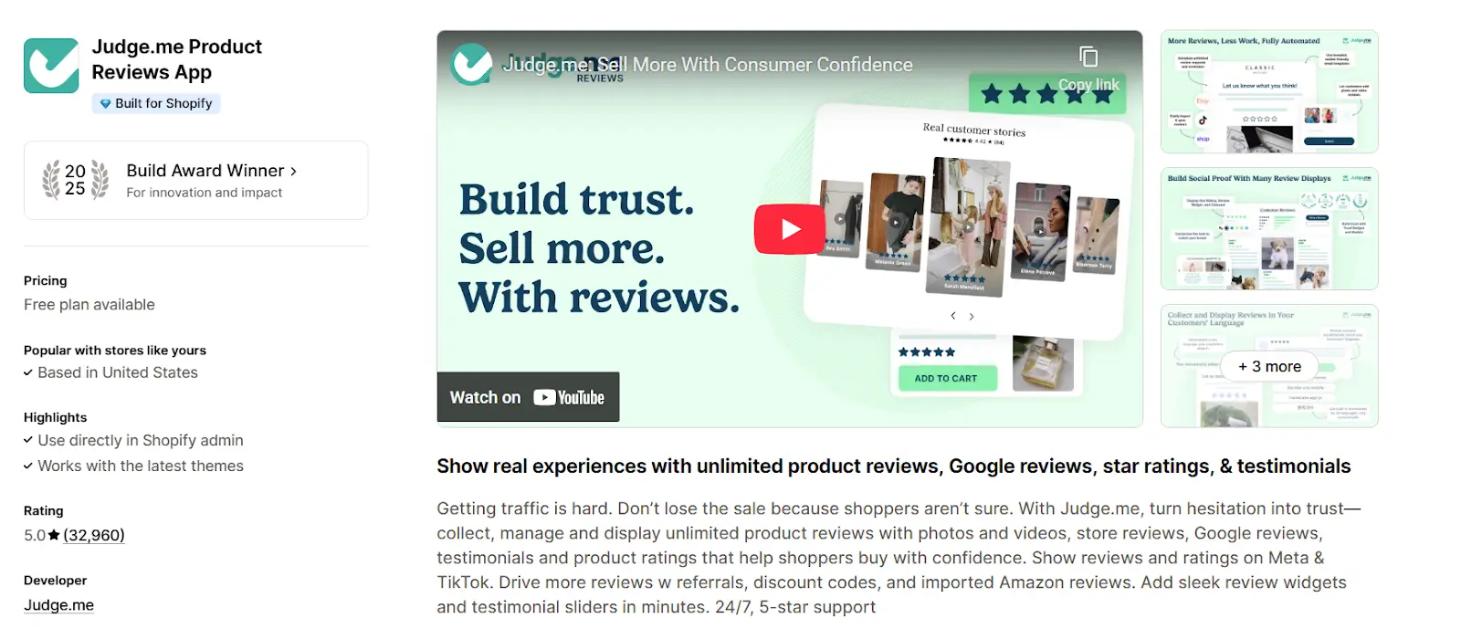 Reviews are one of the strongest trust signals because they help shoppers feel sure at the exact moment they decide to buy. Judge.me addresses that hesitation by collecting and displaying product and store reviews with clear star ratings, so your paid and SEO traffic doesn't stall on the product page.