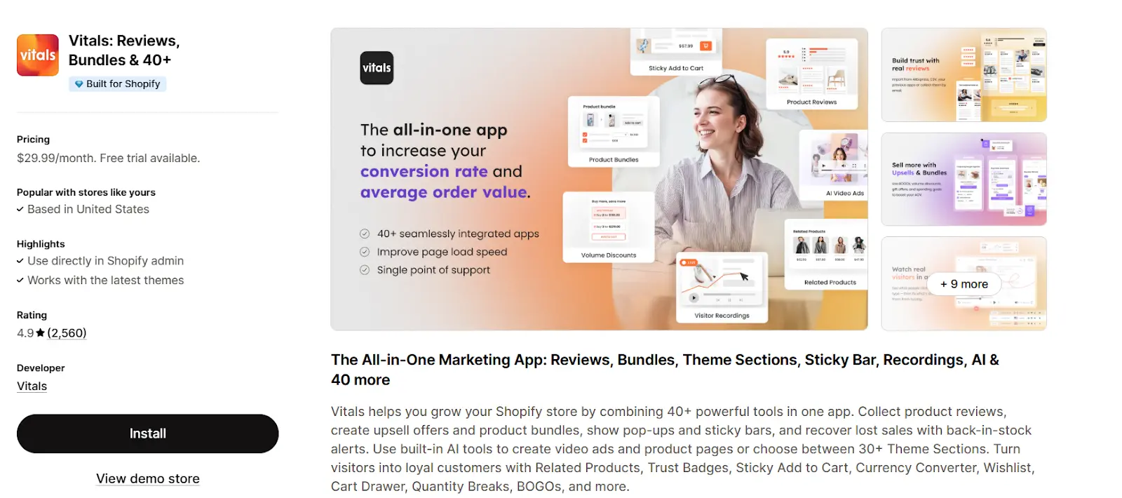 Vitals solves the problem of small cart sizes by introducing bundle mechanics. That means you can launch quickly, test often, and place at key decision points such as the product page, cart, and post-purchase.