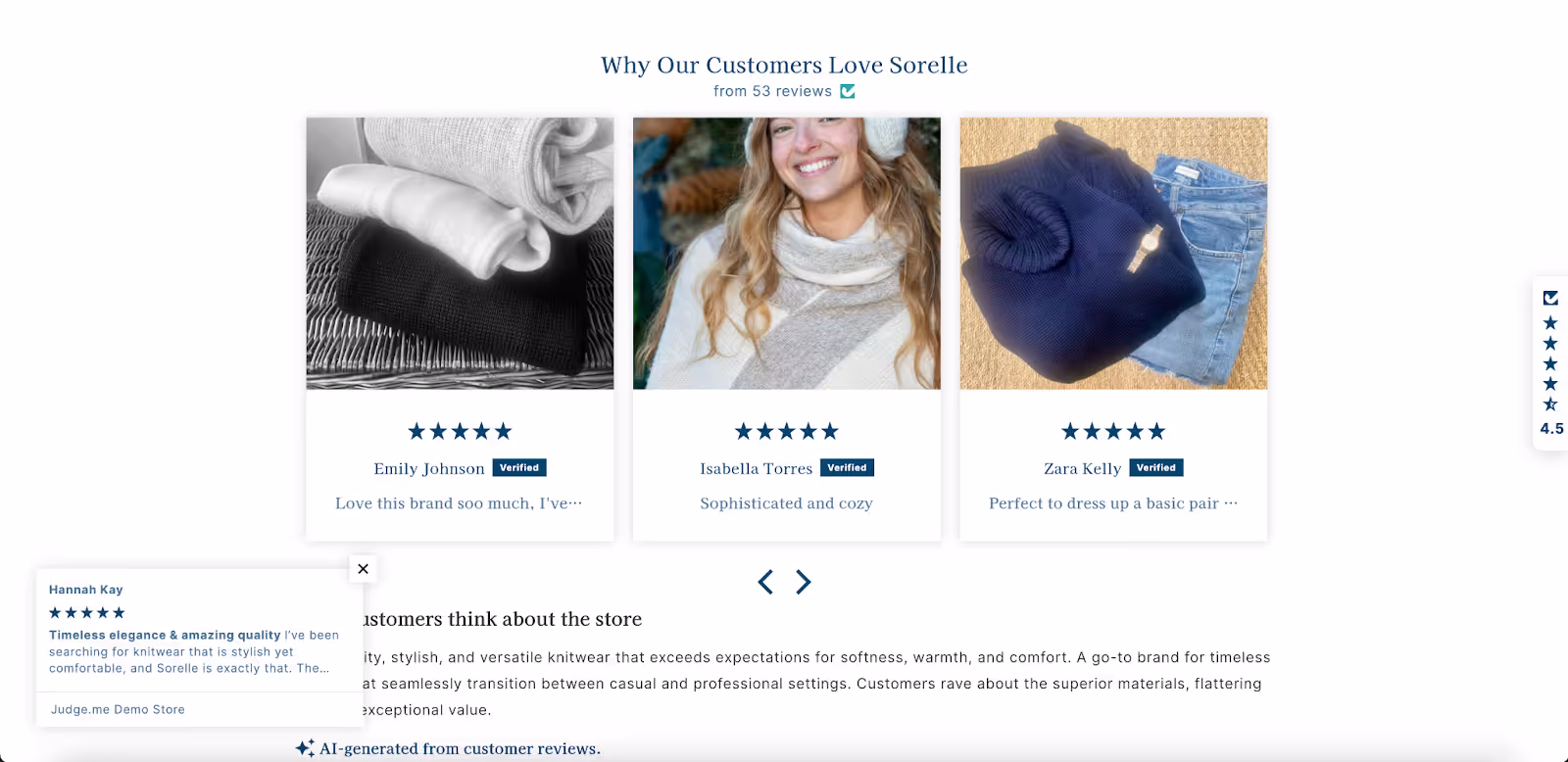 Judge.me provides star ratings, review sections, carousels, media grids, Q&A, and trust badges that match the store’s theme.