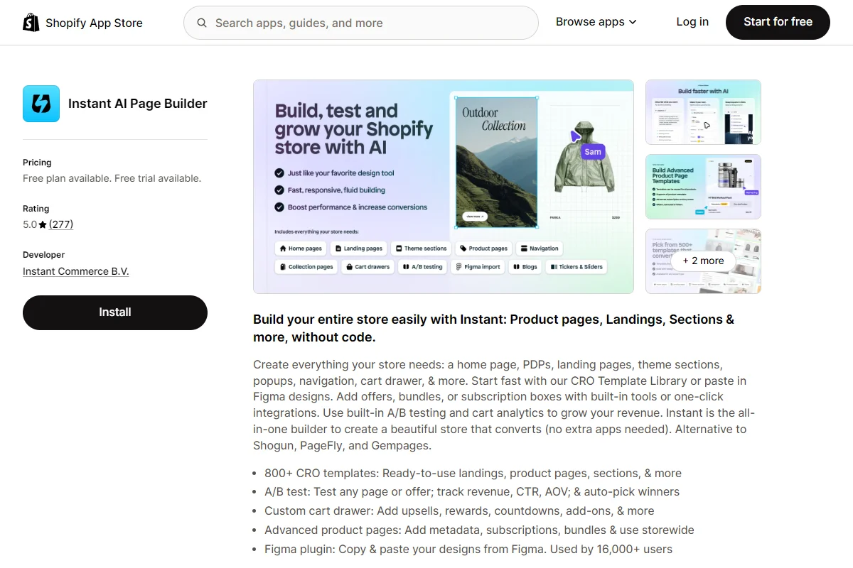 What it is: A no-code visual page builder that publishes as native Shopify Liquid code, with built-in A/B testing and a Figma-to-Shopify plugin.