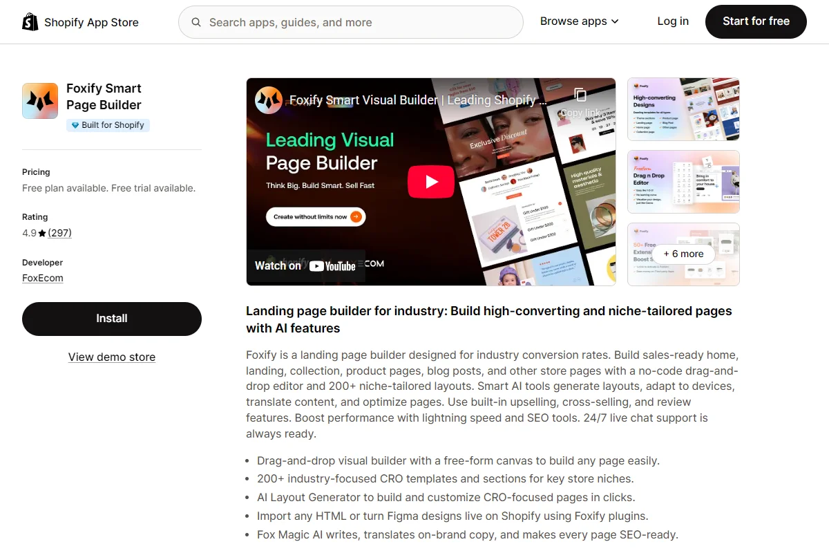 The AI layout feature is worth calling out. While several page builders now offer AI copywriting, Foxify's AI generates entire page layouts based on your inputs. It's a faster starting point than browsing through template libraries, especially if you're building a lot of pages.