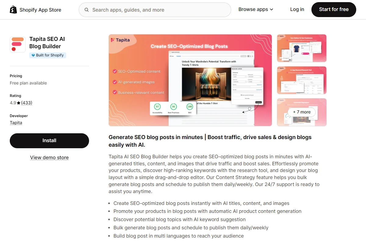 Worth noting: Tapita has restructured its Shopify presence into separate apps. The "SEO AI Blog Builder" is the primary listing for page building and content generation. There's a separate companion app for technical SEO (meta tags, image optimization, site speed).