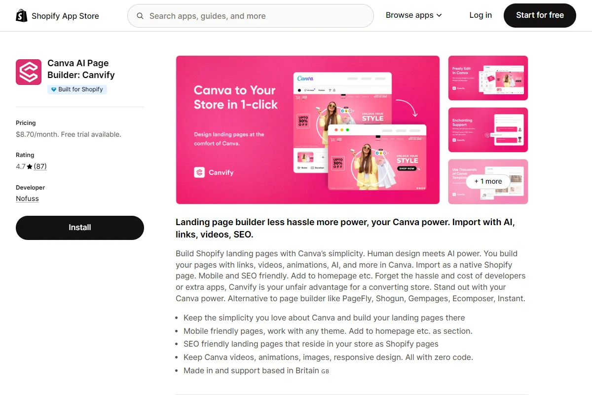 What it is: A Shopify app that turns Canva designs into native Shopify pages. Design in Canva, paste the URL, publish.