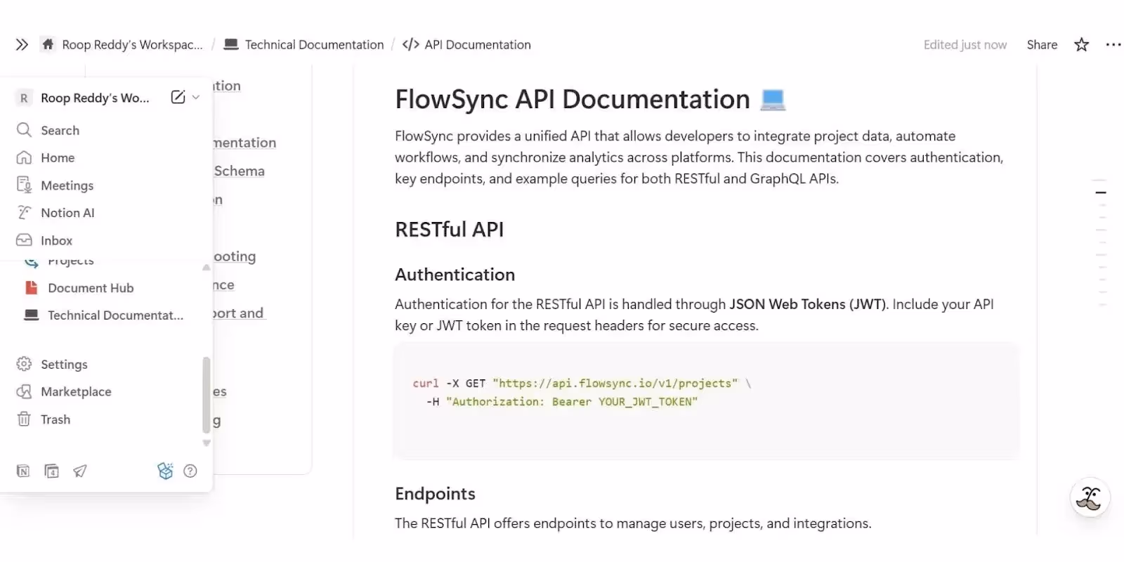 Its block-based editor makes writing and organizing content simple for both technical and non-technical users. Teams can embed code blocks, link databases, and create structured documentation that’s easy to navigate.