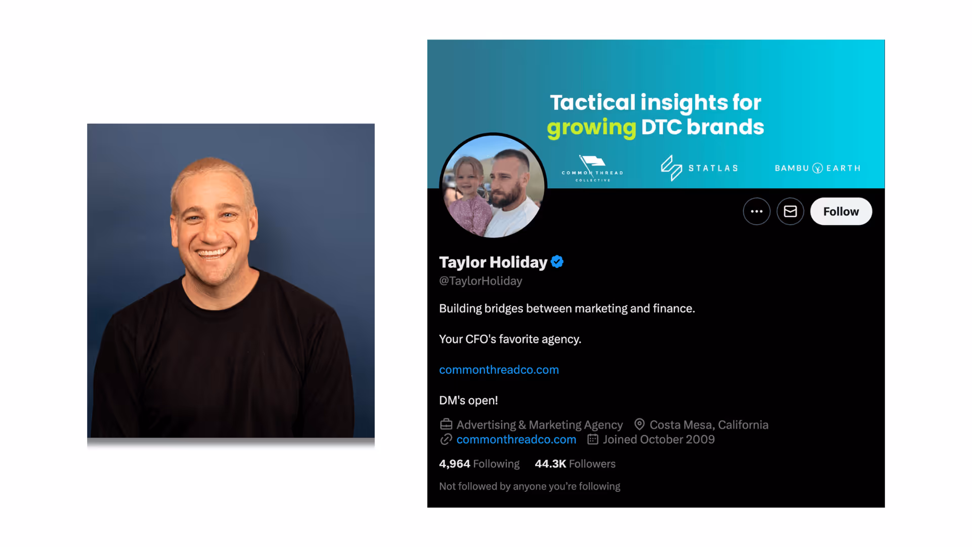 Taylor Holiday, the CEO of Common Thread Collective, is a must-follow for anyone passionate about ecommerce. As the head of an agency dedicated to making clients both profitable and scalable, Taylor dives deep into the metrics and experiments that drive ecommerce success.