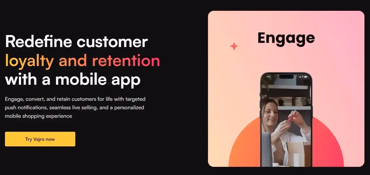 Vajro is a Shopify-focused drag-and-drop app builder that mainly serves smaller eCommerce apps. Their platform relies on templates and drag-and-drop widgets to create branded apps linked to Shopify through API.