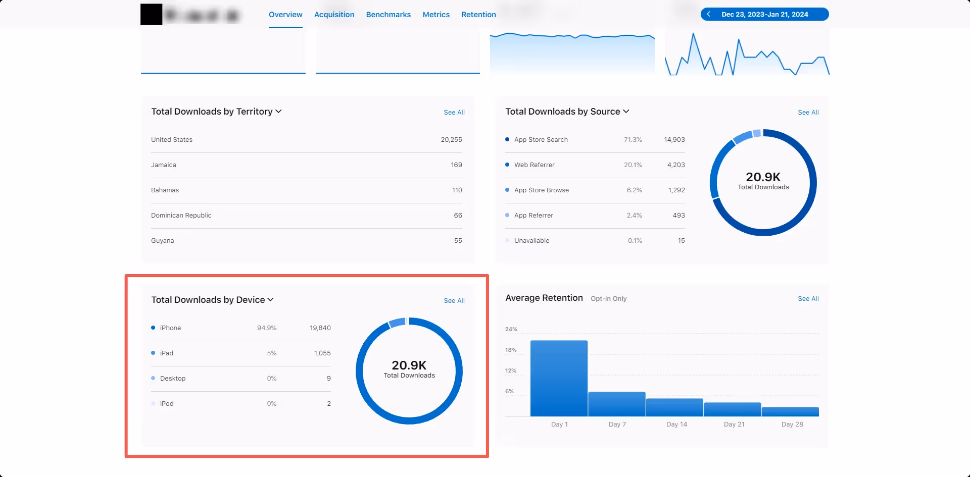 Under the "Overview" area, scroll all the way to the bottom, where you will be able to see the metrics for "Total Downloads by Device":