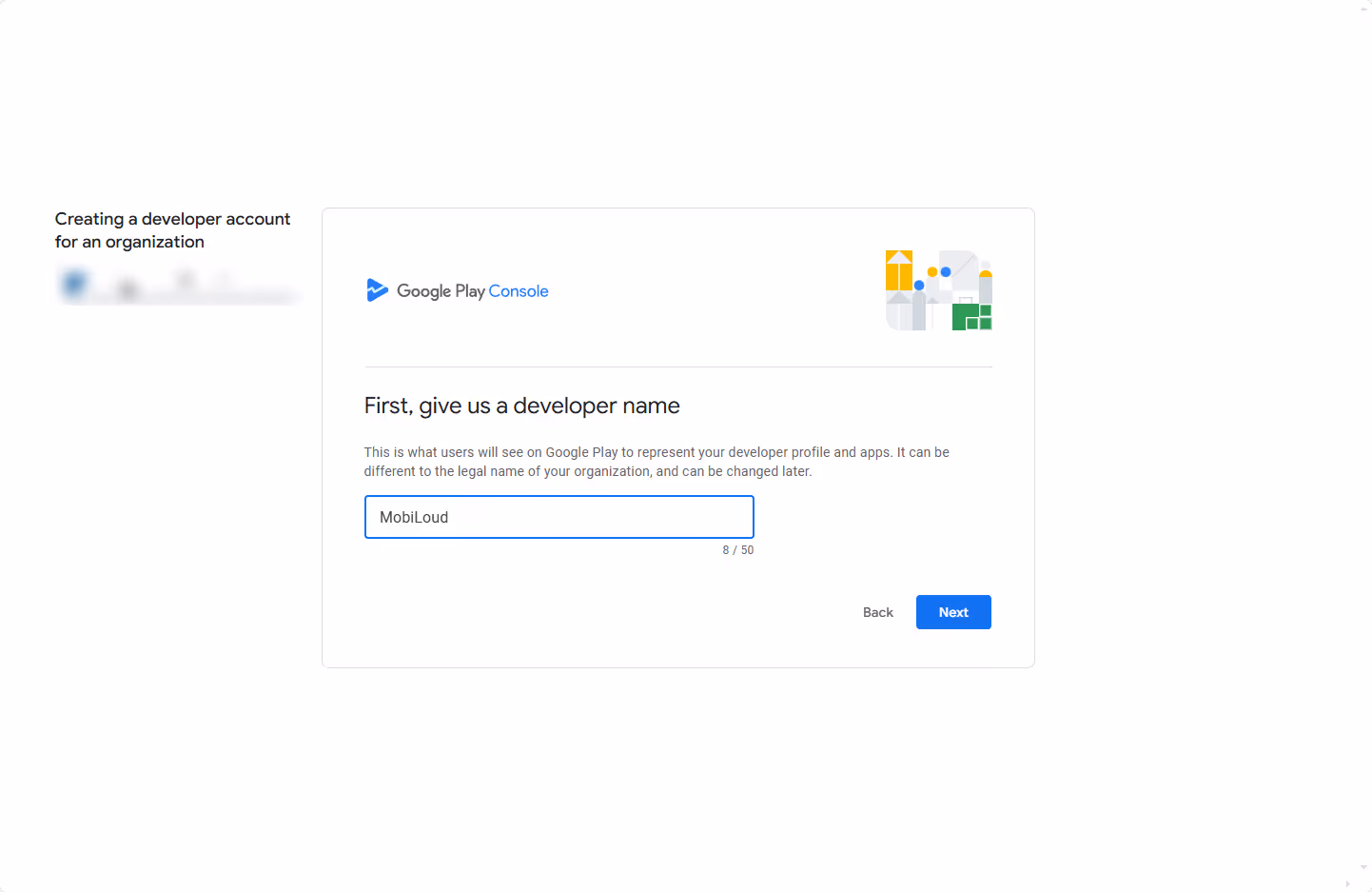 Enter your company name as your developer name, exactly as you want it to appear on the Play Store. This name will be publicly displayed, so make sure to use the correct spelling and capitalization. For example, if your company is called "Tech Solutions Inc.", entering "tech solutions inc" or "TECH SOLUTIONS INC" may not look as professional as "Tech Solutions Inc.".