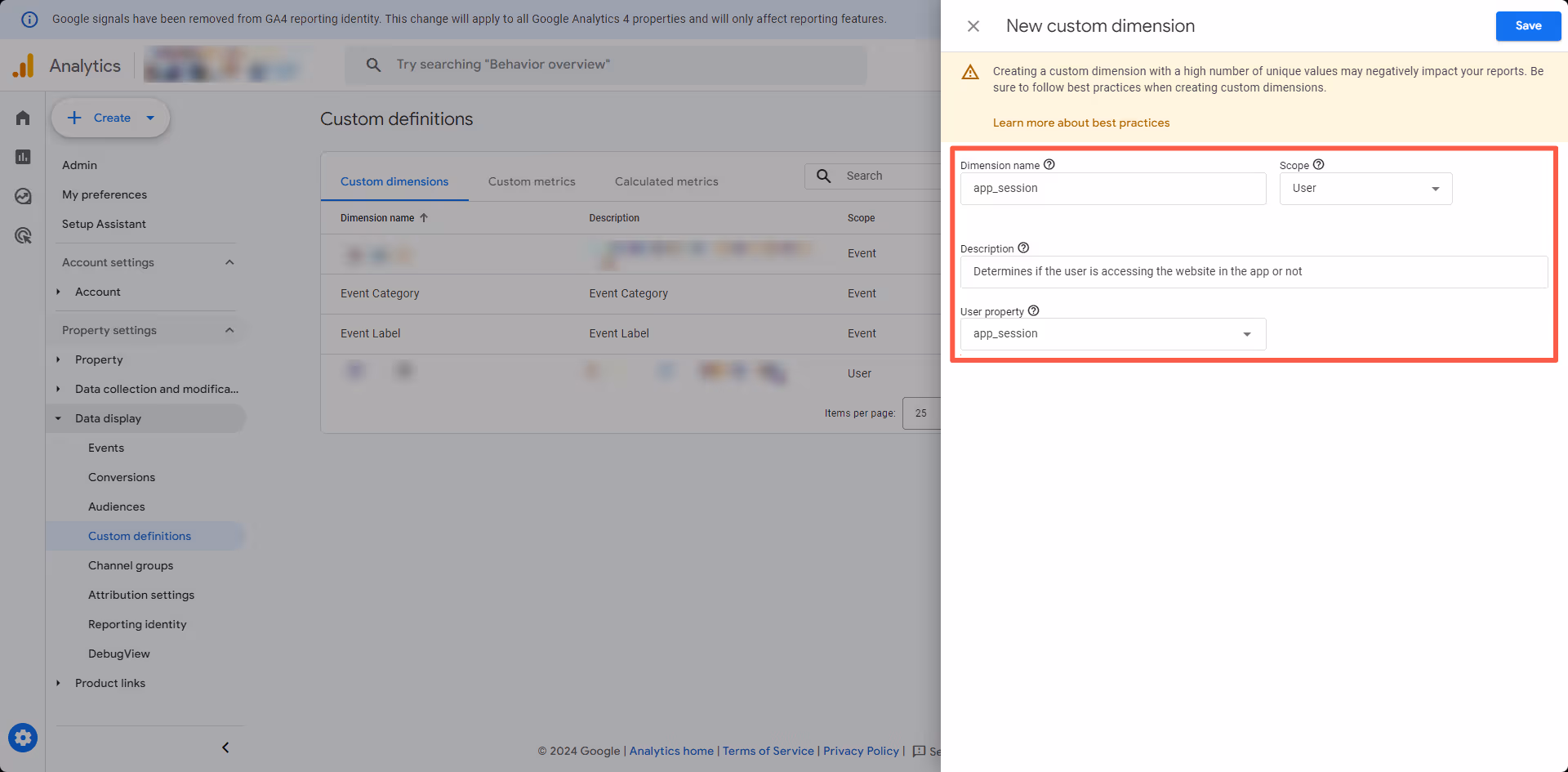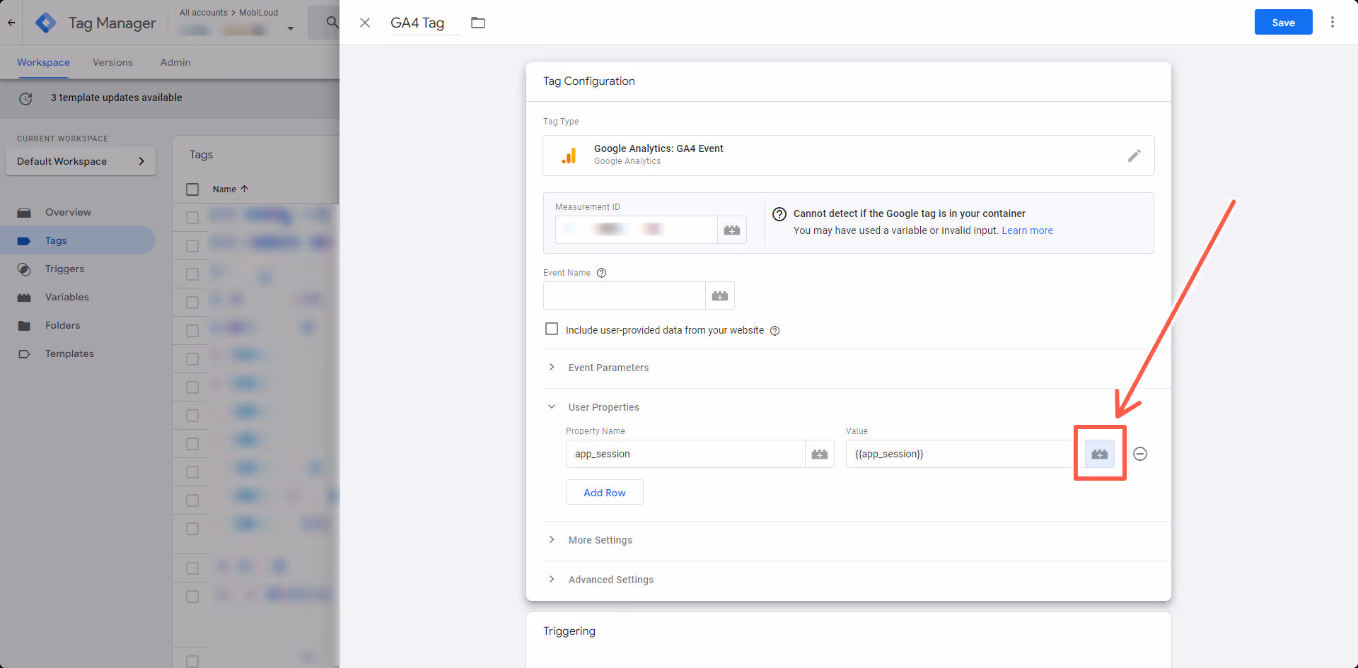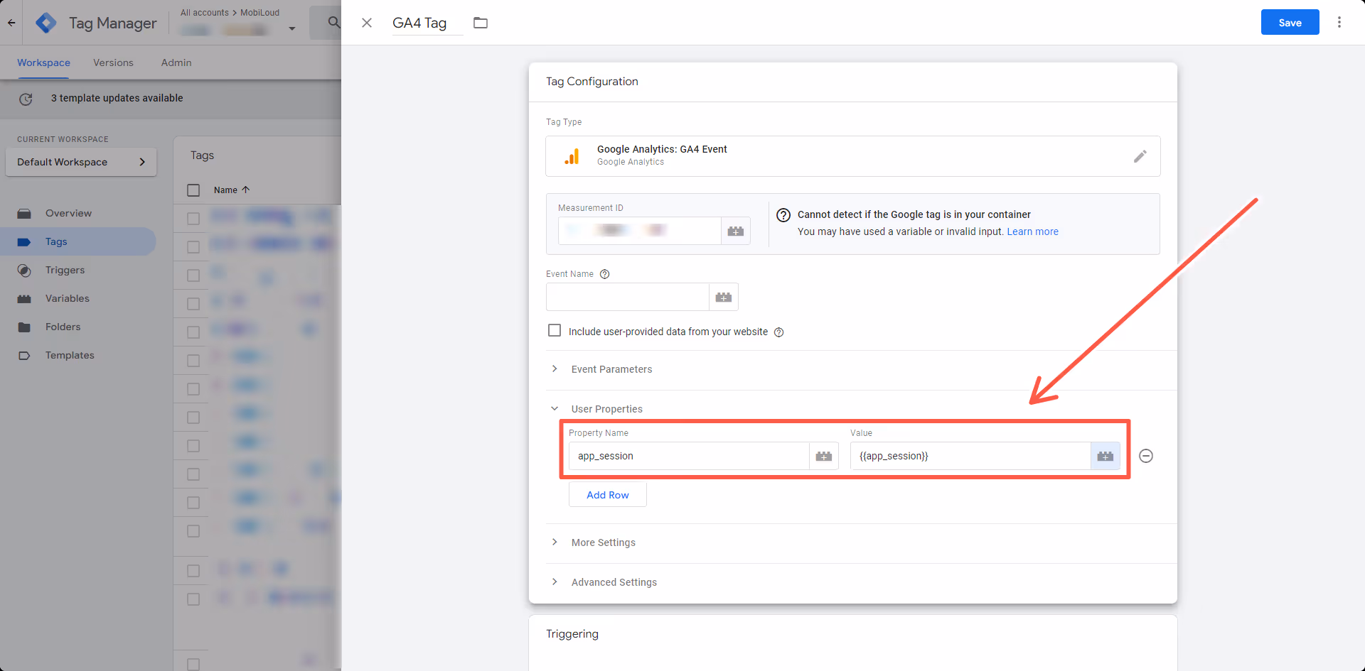 Expand the “User Properties” area and fill the “Property Name” field with “app_session”: