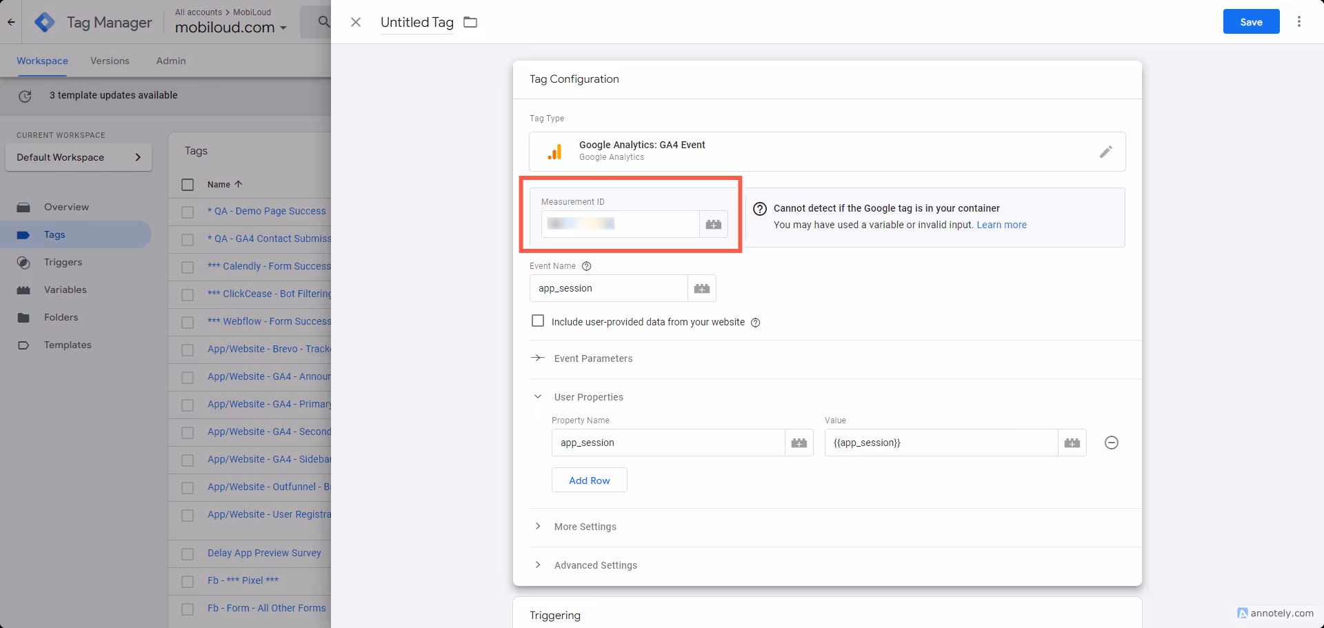 Note: Please ignore the variable name in the screenshot. Use "MobiLoud - Mobile App Tracking" for consistency and easy troubleshooting for our team.