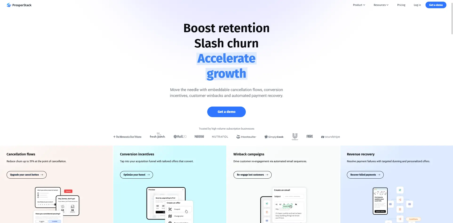 Beyond just preventing cancellations, ProsperStack provides a comprehensive suite of tools to boost revenue and customer loyalty. Shopify Plus brands can leverage its conversion incentives to turn more visitors into paying subscribers, and its automated winback campaigns to re-engage lapsed customers. The platform also includes a robust revenue recovery system to combat passive churn from failed payments.