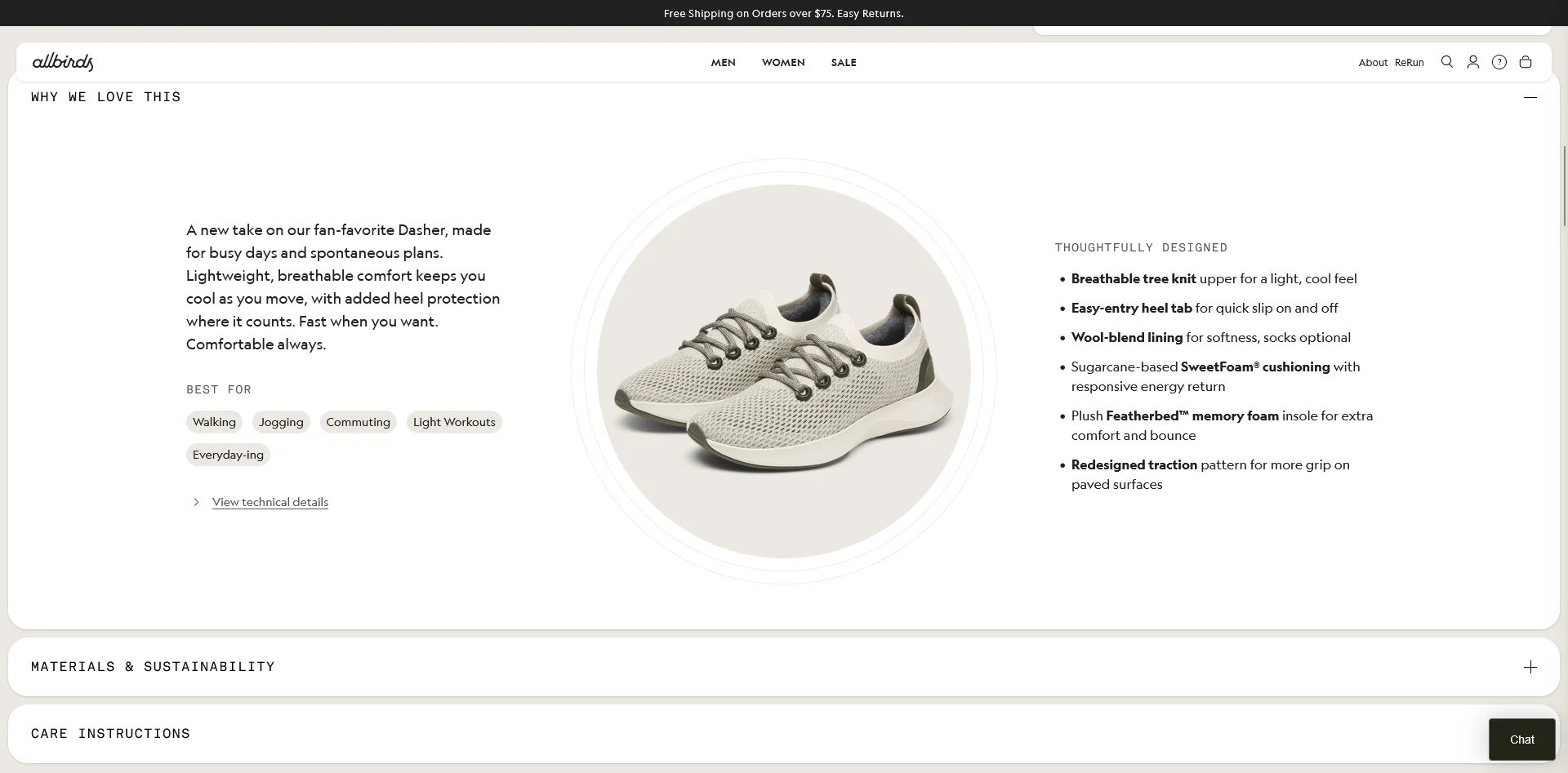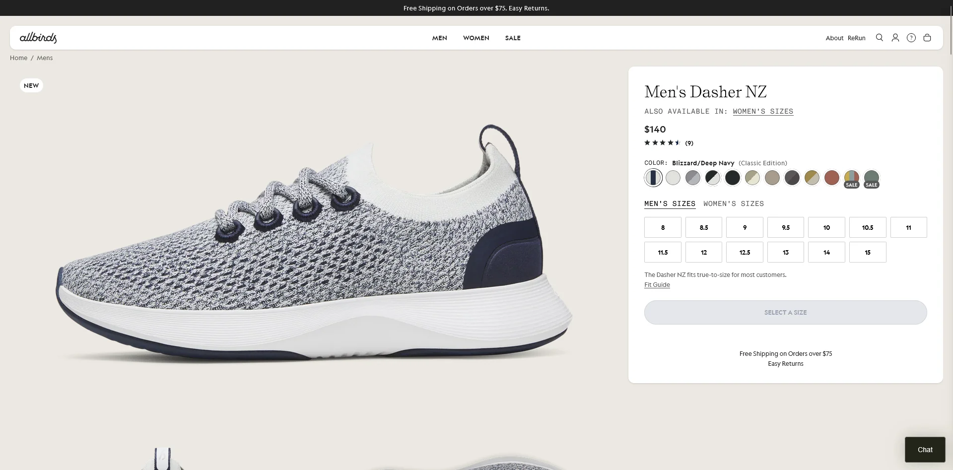 Allbirds keeps their PDPs clean and focused. Highlights: sustainability messaging woven into the product story; customer reviews with fit feedback ("Runs true to size"); a "Find Your Size" tool; and a limited, curated color palette that reduces decision fatigue. They lead with benefits (comfort, sustainability) rather than specs.