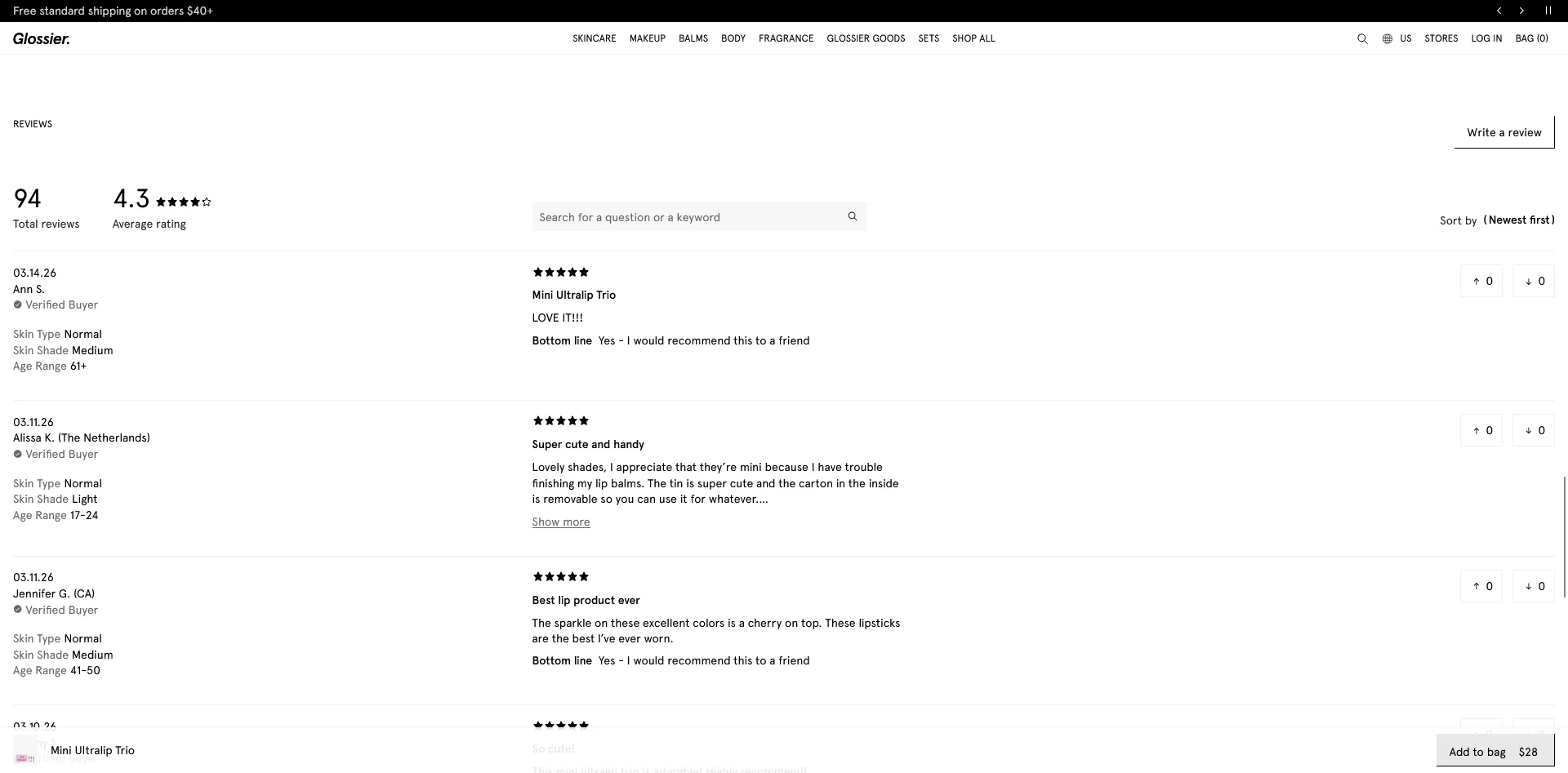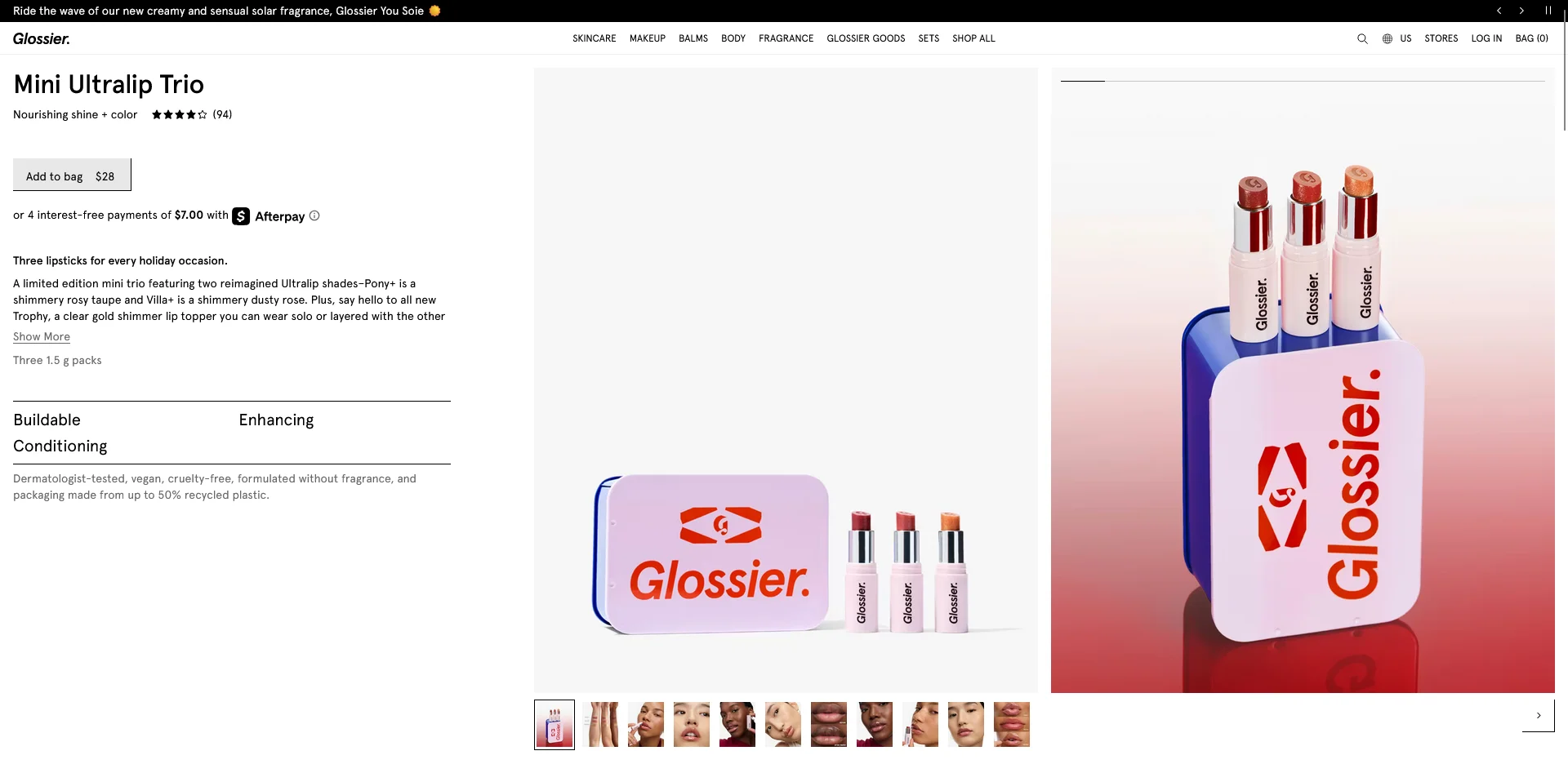 Glossier's PDPs showcase the power of community-driven social proof. Their review section lets shoppers filter by skin type and concern, making reviews personally relevant. They bundle products with clearly communicated savings and embed lifestyle UGC throughout the page.