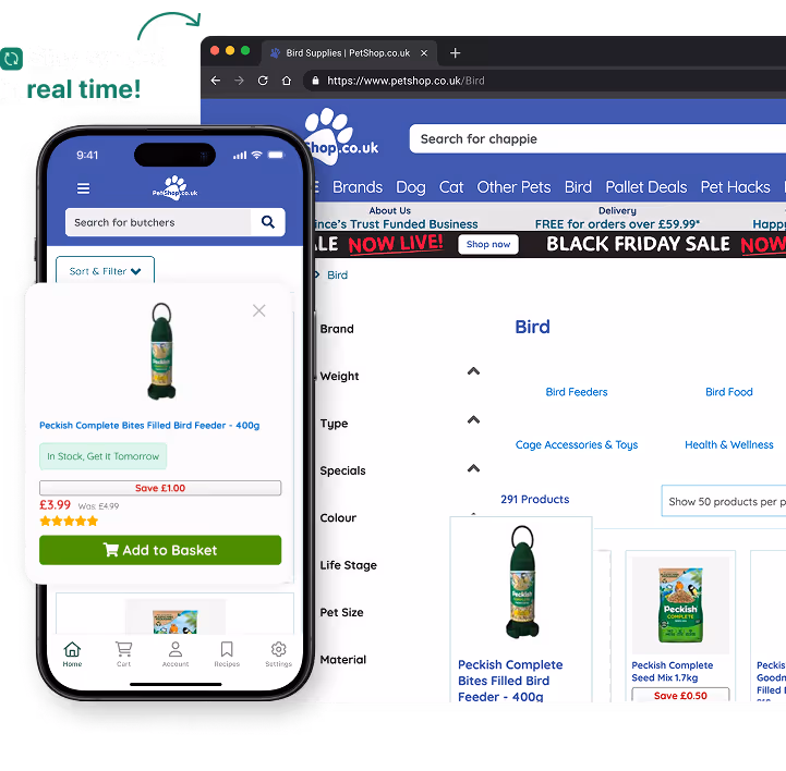 • Real-time sync with your products, pricing, and fulfillment — no rebuild needed