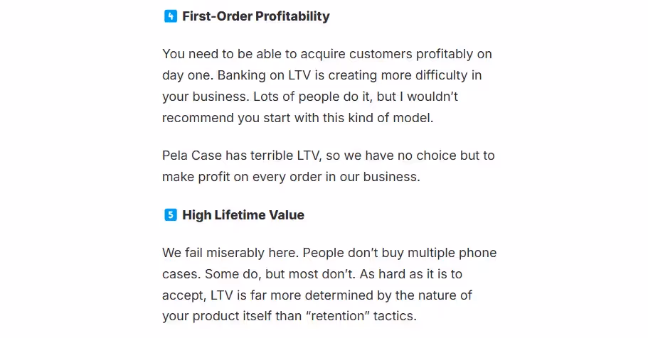 For example, Matthew Bertulli, CEO of Pela Case, explained how first order profitability is vital for his business, as they don’t have the reliable repeat purchase rates to justify losses on the initial sale.