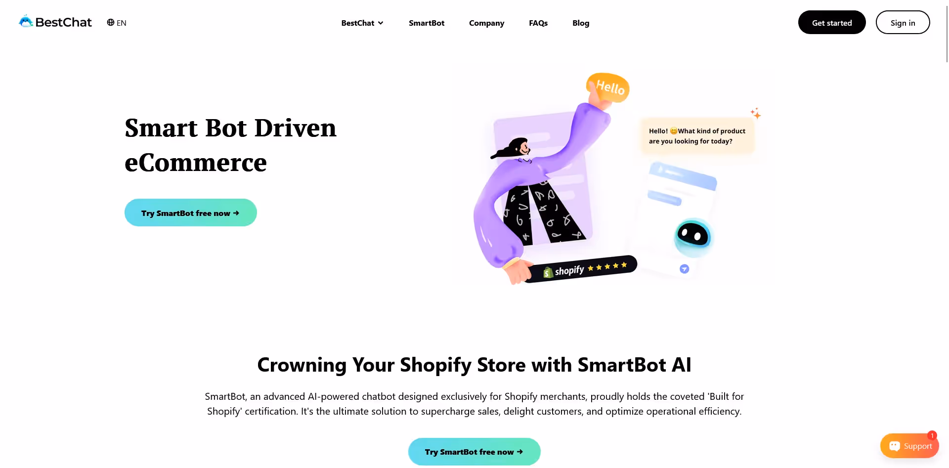 SmartBot offers AI-driven customer support that learns and adapts to store products, providing 24/7 support with AI chat invitations to drive conversions.