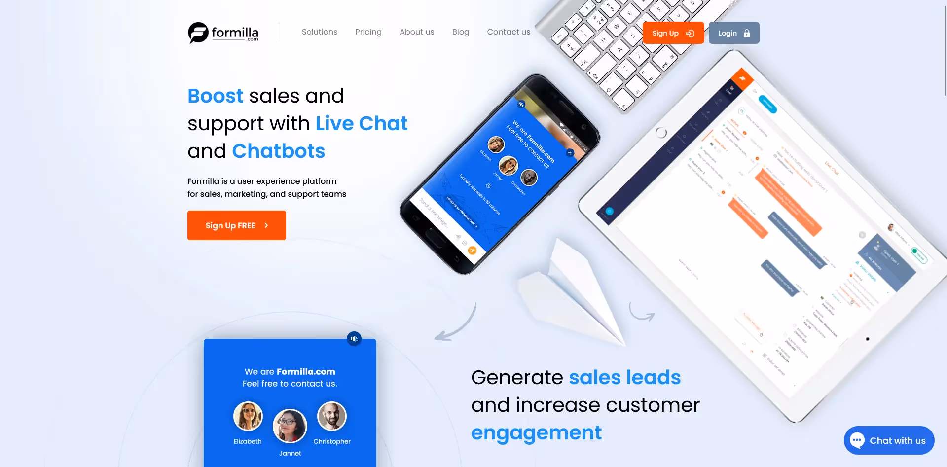 Formilla offers real-time chat and chatbots proven to increase sales and improve support, with visitor tracking, lead qualification 24/7, and marketing popups to boost conversions.