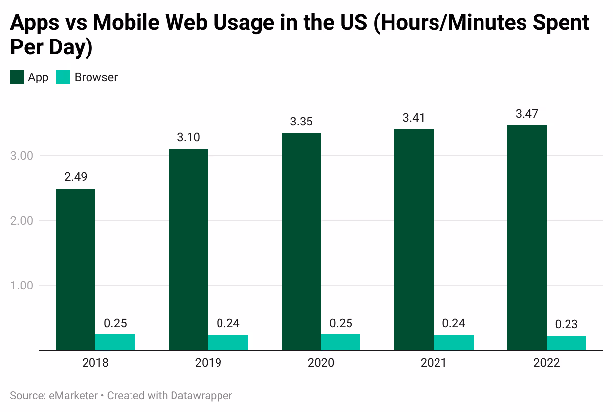 Data backs that up, showing that 90% of the time we spend on mobile devices is spent using apps. This chart from eMarketer shows that the share of app usage vs mobile websites is only going up.
